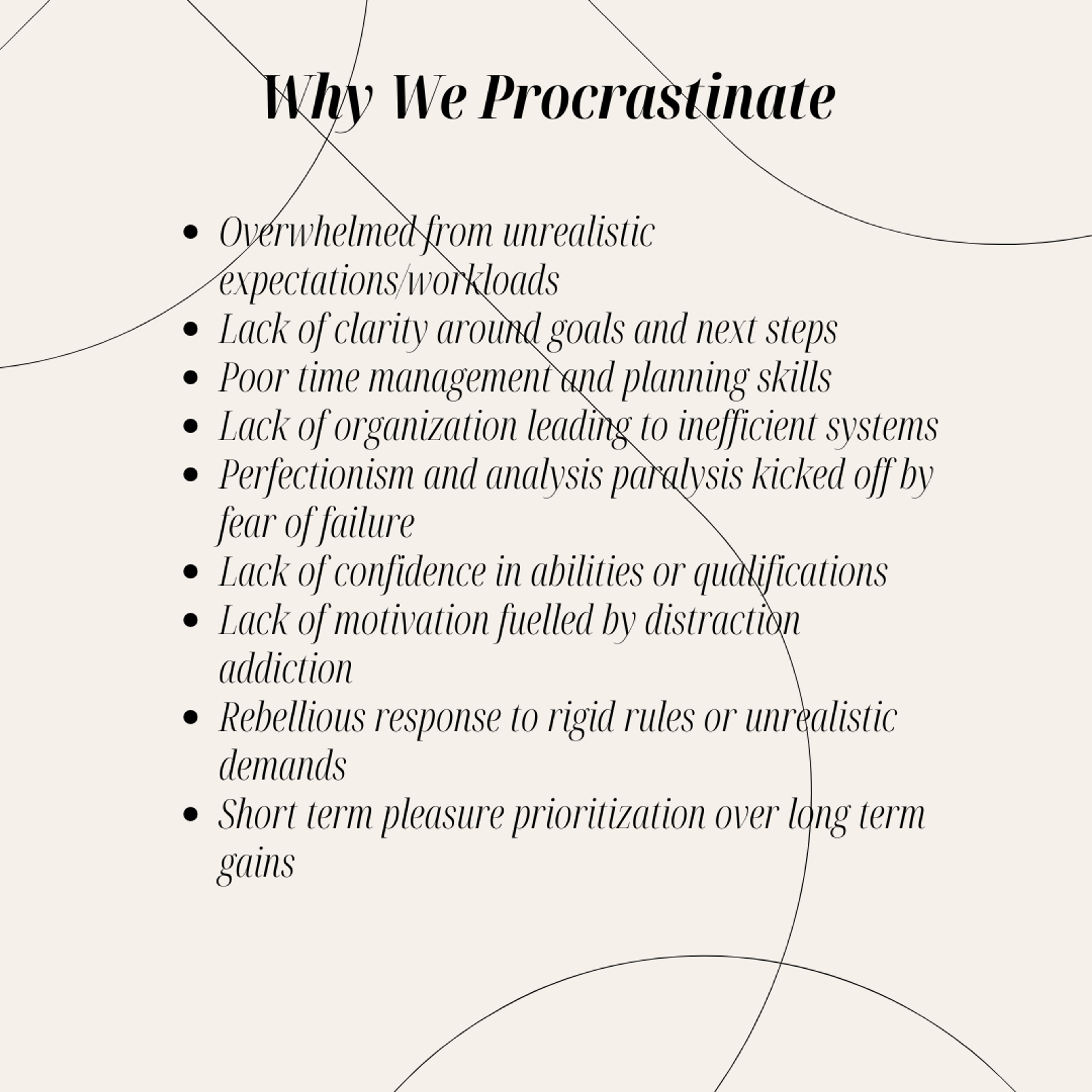 Before charging forward with anti-procrastination strategies, it’s important to understand WHY we postpone important work in the first place. The reasons are varied and often interconnected. Common motivations include:
